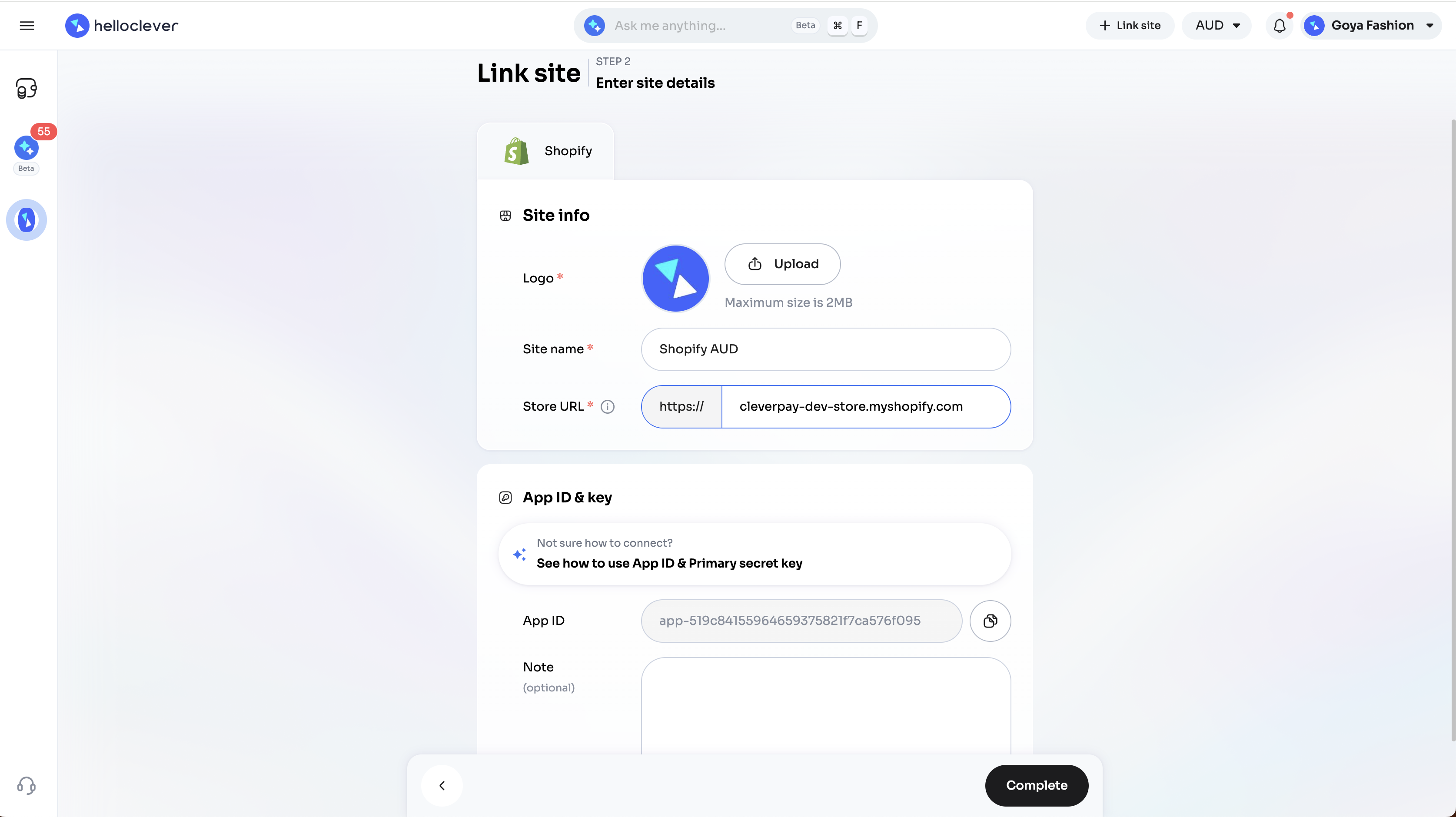 - Each pair of App ID and Secret Key from the Hello Clever Merchant Dashboard can be used for a single Shopify store only.