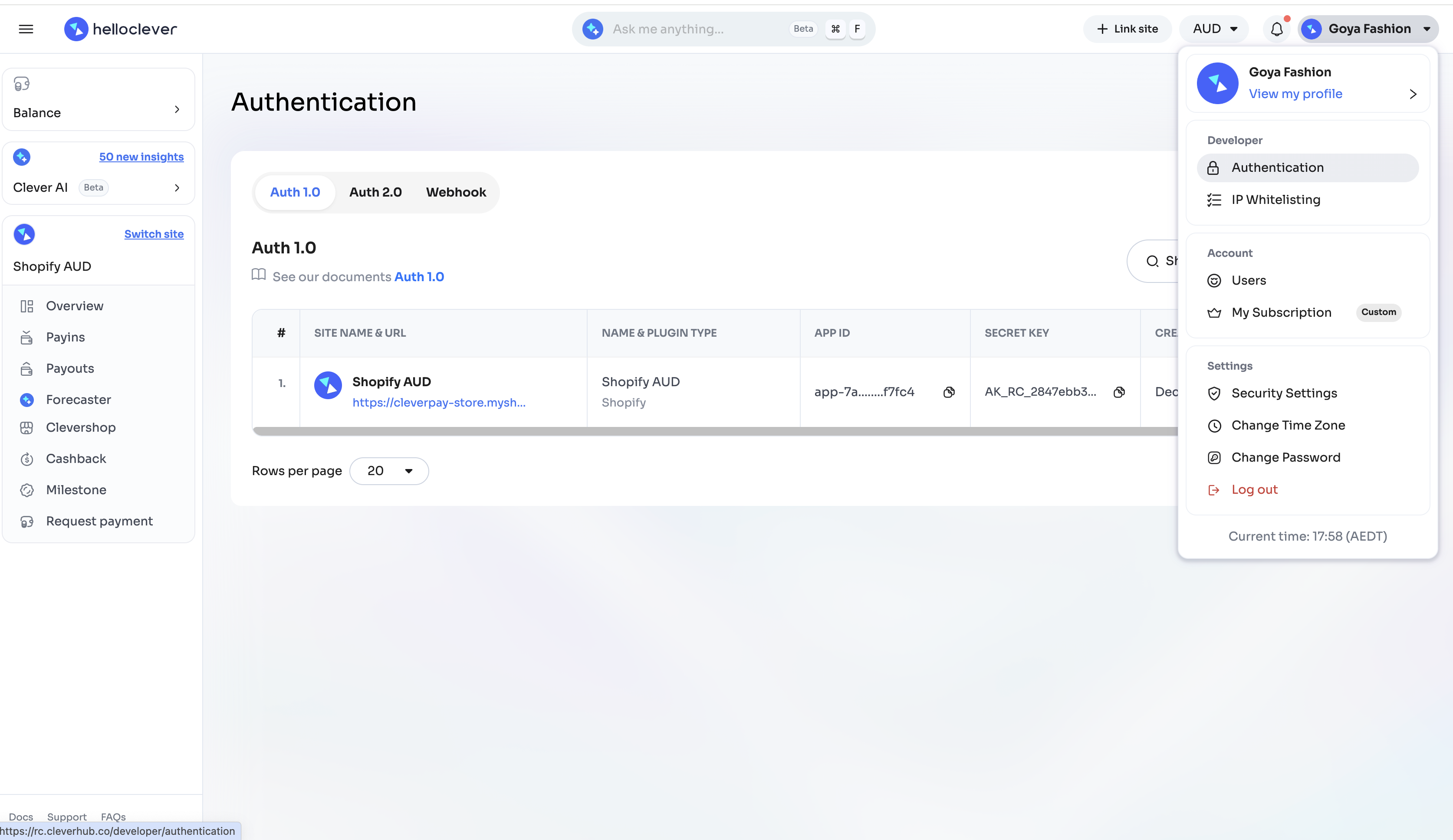 Before connecting Hello Clever to Shopify, you need to generate an App ID and Secret Key from your Hello Clever Merchant Dashboard.