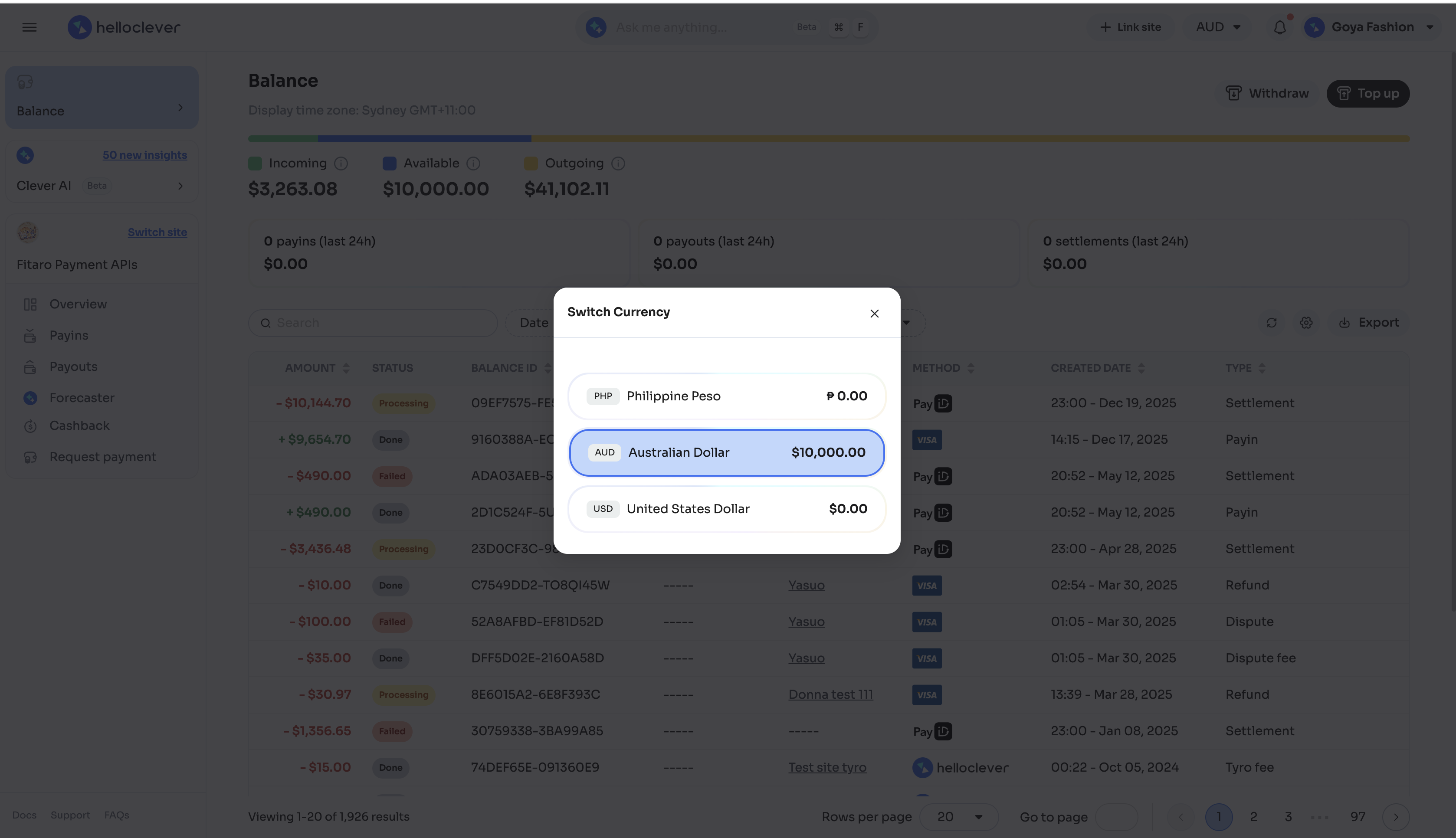 Hello Clever supports multiple countries and currencies depending on your merchant account setup.